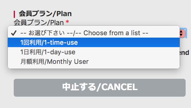 | 월 정액제 이용 | ※한달동안 몇번이나 이용하셔도, 30분 이내 이용이라면 추가요금이 청구되지 않습니다. 30분을 넘기시면<165엔/30분당>추가요금이 청구됩니다. ※1회 이용/1일 이용등 플랜을 변경하지 않는 한, (2200엔/매월) 이 기본요금으로 매월 청구됩니다. 그러므로 한달 동안만 이용하실 경우에는 꼭 플랜을 변경해 주세요! HUBchari는 고객님이 변경하시지 않아서 매월 요금이 청구된 경우에는 환불해 드리지 않습니다. | ー | ー | |